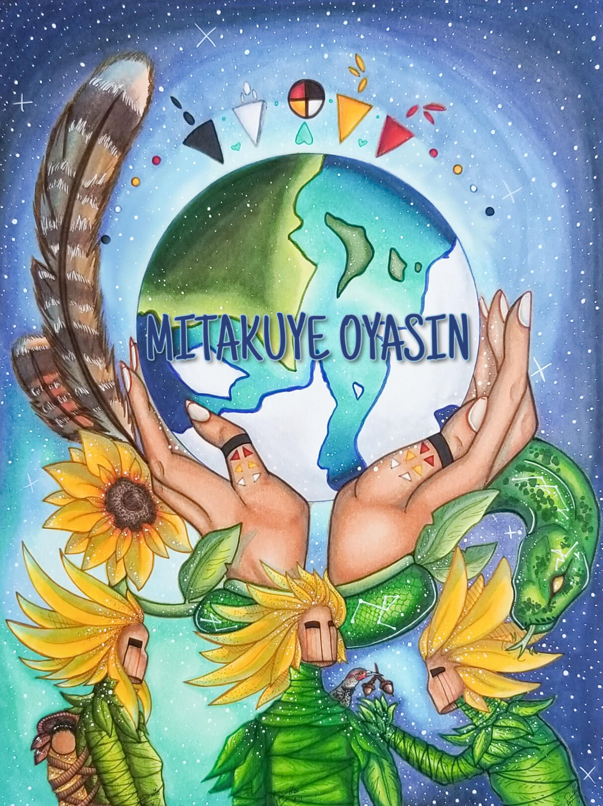 "Our First Mothers" is my illustrated series representation of the teachings of the medicine wheel, whether it's from us two-leggeds or from higher otherworldly beings like Kachinas, who share the Beauty Way so that we may walk in our ancestors' footsteps and pass down our heritage from generation to generation. It shows how sacred simple lessons are and how they make us proud to be those who walk in the footsteps of our First Nation people, and to honor the sacredness of our creatures and Great Mother who nurtures us in the process, and what they teach us and have taught us for centuries to come.We as Indigenous people carry a heavy weight of our history, and the Crossroads that guide us in this life and in the spirit world teach us not to treat our heritage as a burden or a forgotten time. Our loved ones are still guiding us, our higher beings are still watching us, and the Creator has never forgotten us. I believe it's important for Indigenous and non-Indigenous people to understand that we are still here and we will be heard. The Ina Sunflower Kachinas are bright Kachinas; they mother us and remind our young ones to grow up proud and accepted. To enjoy their teachings in their youth, for when they transition to lessons as young adults, as well as to share these lessons with the ones after. It's a cycle of sacred Medicine that has carried on before us and will after us. We walk in beauty as warriors and caretakers, as we always have since the beginning.